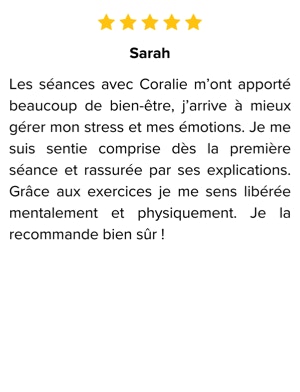 Chaque séance est conçue pour vous redonner confiance et motivation et vous offrir des outils concrets pour mieux vivre au quotidien.